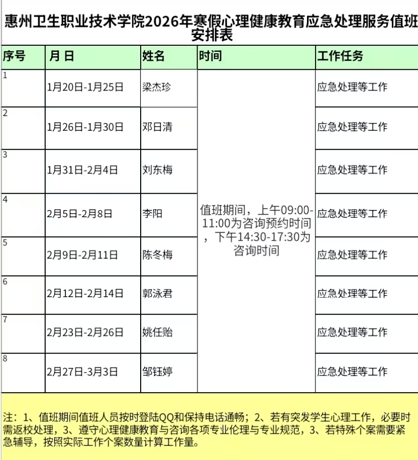 惠州卫生职业技术学院2026年寒假心理健康教育应急处理服务值班安排表